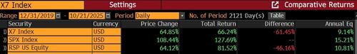 El índice X7 ha tenido un rendimiento inferior al del SPX en un 6% y al del RSP en un 1,7% desde 2020…