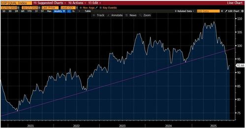 i. El par de calidad tiene un rendimiento inferior porque el segmento de baja calidad ha superado al de alta calidad . Este último se ha movido en línea con el S&P 500. Al analizar el segmento de baja calidad, observamos temas claros: computación cuántica, drones, robótica, vehículos autónomos, tecnología nuclear, criptomonedas, atención médica con inteligencia artificial y algunos temas no seculares de baja calidad. Estos temas innovadores tienen una puntuación muy baja en la escala de rentabilidad y suelen ser empresas de menor tamaño, todas características de “baja calidad”. Faris Mourad.