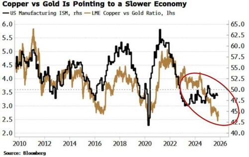 La relación cobre-oro es consistente con una desaceleración económica en Estados Unidos, que podría hacerse más evidente una vez que finalice el cierre del gobierno y se reanuden las publicaciones de datos.