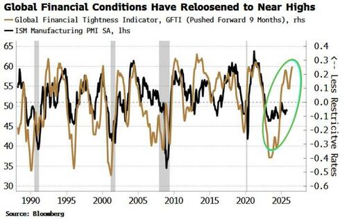 Podemos extender esto al Indicador Global de Estrechez Financiera, que es una difusión de las subidas de tipos de interés de los bancos centrales, junto con otras medidas de estrechez financiera, como los precios de las materias primas. Cuando es alto, como lo es hoy, indica que las condiciones son laxas. Las condiciones comenzaron a endurecerse a principios de este año, pero desde entonces se ha revertido por completo.