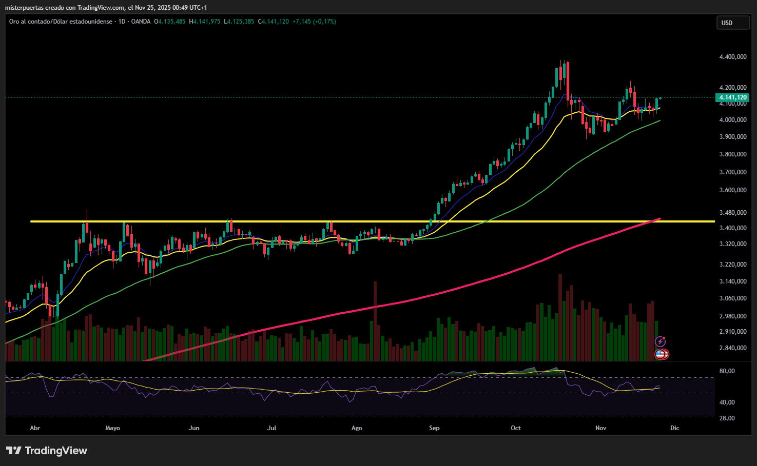 El oro volvió a superar los 4.100 dólares.