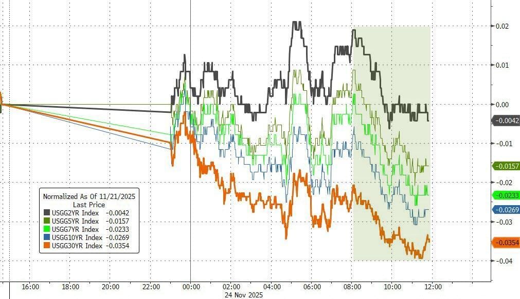 Los bonos también fueron demandados, encabezados por los de largo plazo. También lo fue el dólar (un poquito). El oro volvió a superar los 4.100 dólares. Y Bitcoin se recuperó de las ventas para volver a superar los 88.000 dólares. Los precios del crudo subieron después de tres sesiones perdedoras.