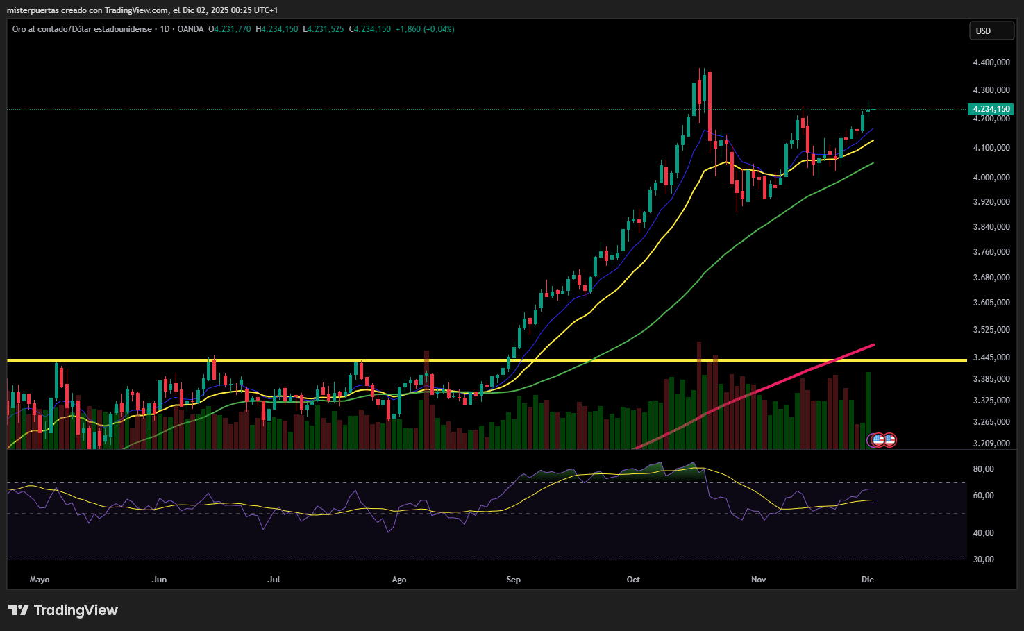 El oro estuvo menos volátil, pero también terminó el día sin cambios, encontrando soporte alrededor de los 4.220 dólares.