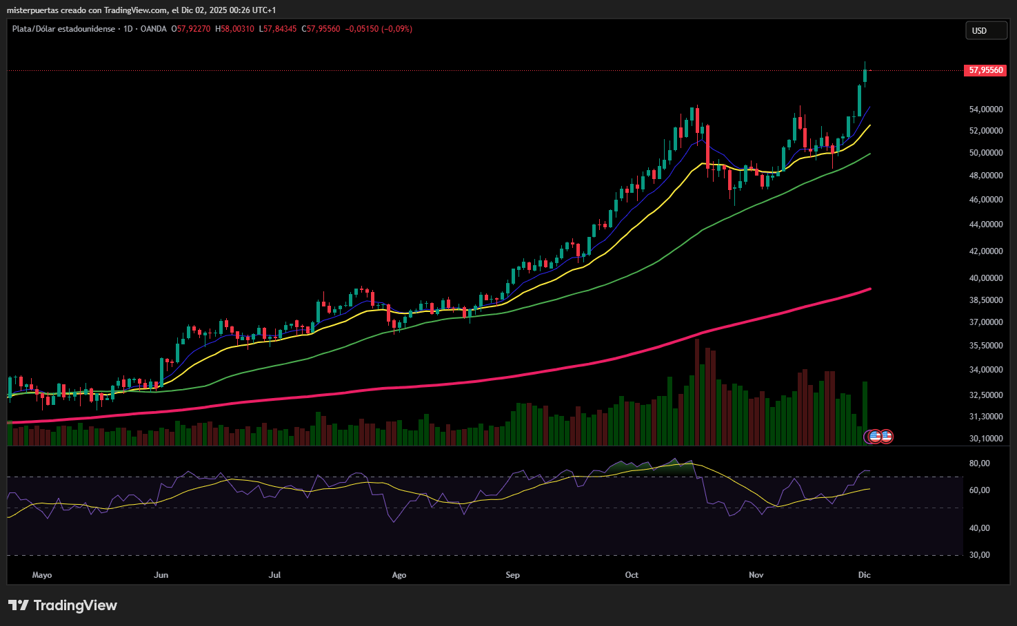 La plata tuvo un rendimiento superior, subiendo por encima de los 58 dólares (un nuevo récord nominal).