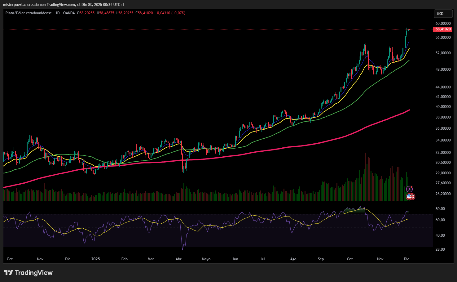 Sin embargo, la plata logró extender sus ganancias y volvió a superar los 58 dólares.