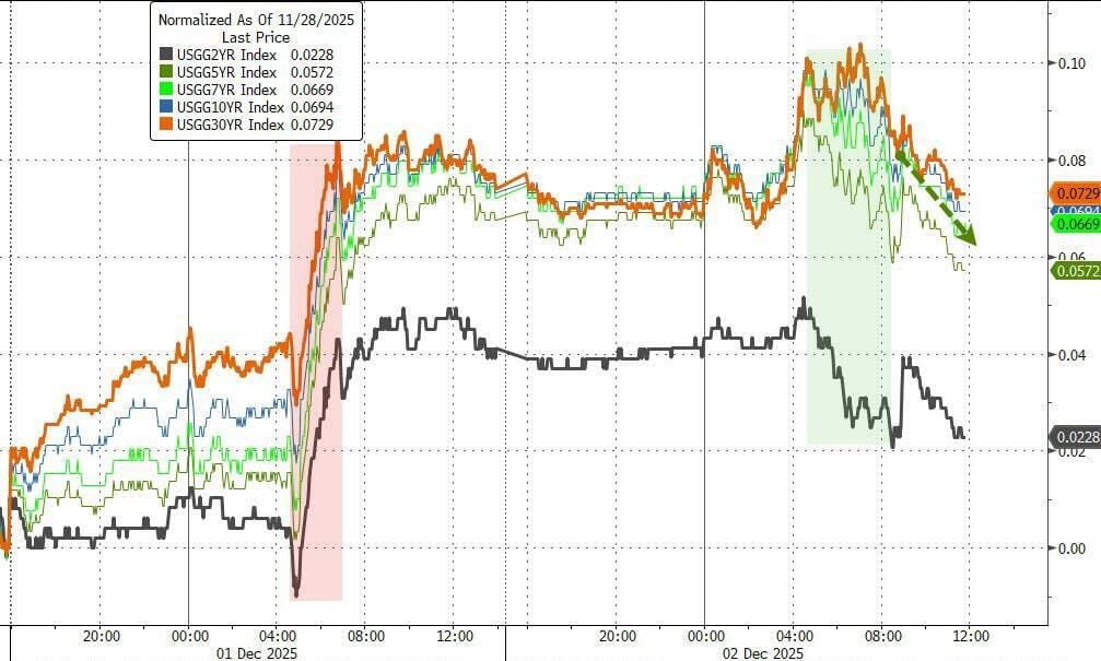 Los rendimientos de los bonos del Tesoro fueron más bajos en general hoy, con los de corto plazo superando al promedio (los bonos del Tesoro a 2 años subieron esta tarde, aunque el movimiento fue muy modesto, -2 puntos básicos).