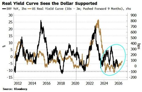 A diferencia del caso moneda por moneda mencionado anteriormente, la cesta muestra una relación más fiable. El tipo de cambio real del DXY es apenas negativo en este momento, lo que sugiere que no hay un fuerte impulso para depreciar el dólar.