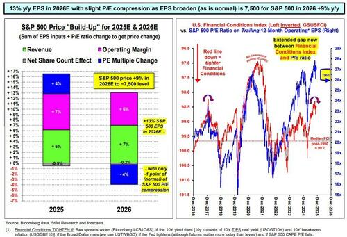 Desde una perspectiva alcista, Stifel sostiene que un crecimiento de EPS del S&P 500 de alrededor del 15% en 2026, junto con solo “un múltiplo de la compresión P/E normal del S&P 500”, elevaría el índice a aproximadamente 7.500, o “poco más del +9%”.