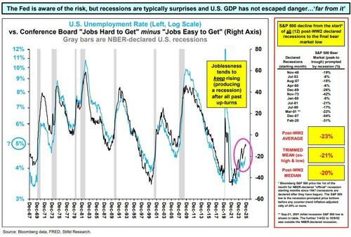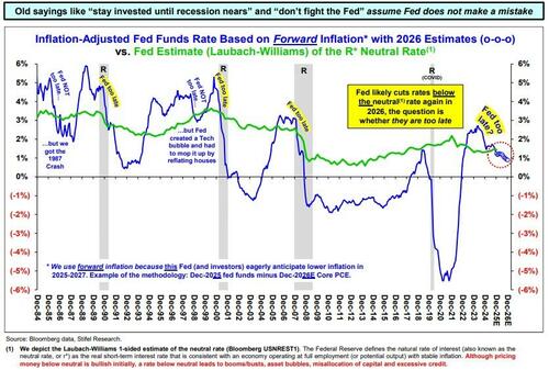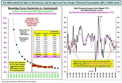 Stifel también describe un claro escenario bajista, basado en posibles tendencias macroeconómicas. Dado que el consumo personal real representa el 68% del PIB, Stifel advierte que el consumo sigue siendo “demasiado grande para ser compensado por el gasto en capital en IA” si el gasto se desploma, y ​​existe riesgo de desempleo/recesión si la desaceleración de la demanda laboral supera lo que, fortuitamente, ha estado ralentizando el crecimiento de la oferta laboral. Cualquier repunte del riesgo económico podría resultar en correcciones en 2026.