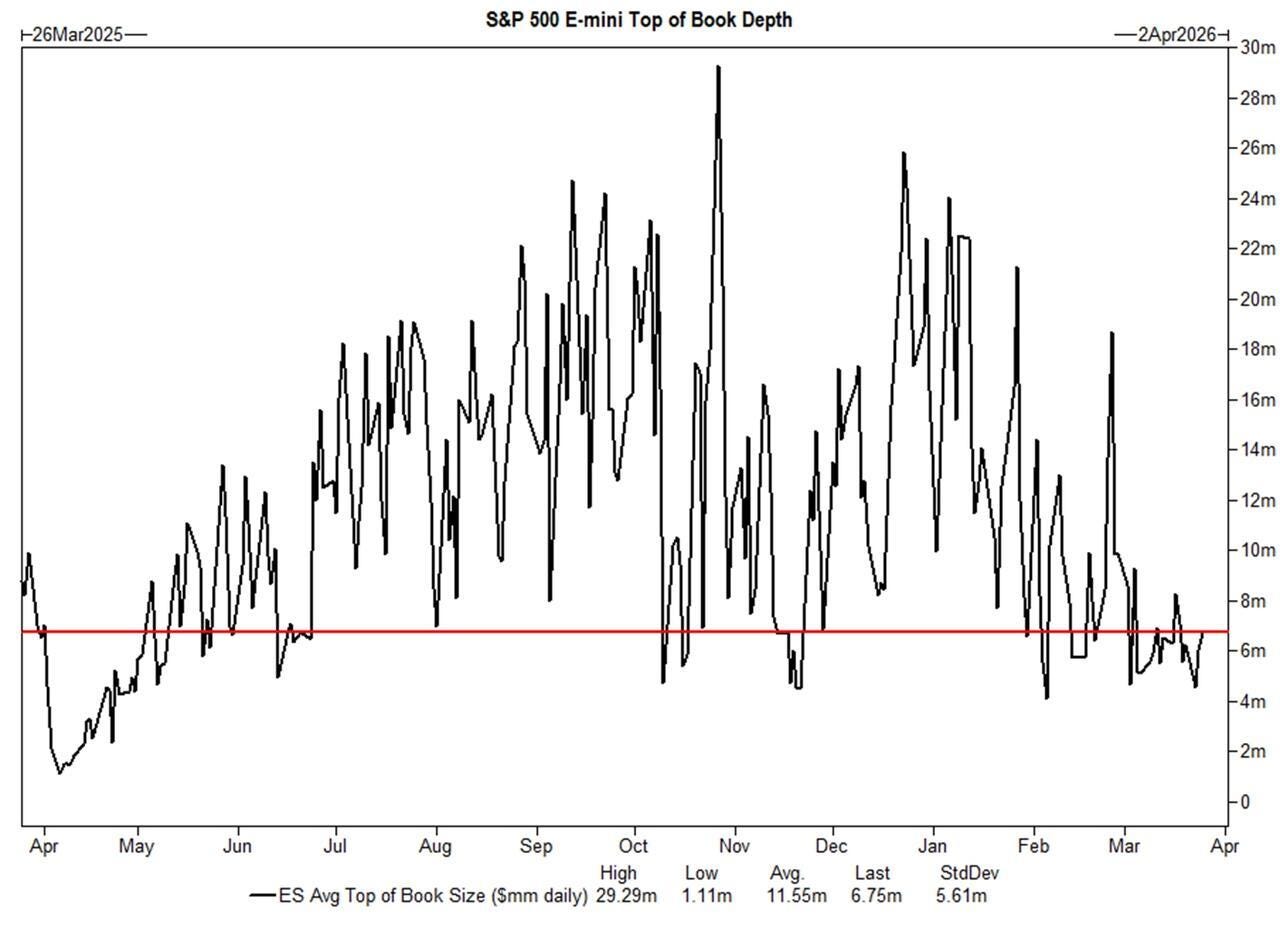 La liquidez de S&P Top of Book, es decir, la capacidad de transferir riesgos rápidamente, se situó en 6,75 millones de dólares al cierre de ayer (frente a un promedio de 11,55 millones de dólares en el último año). Esta cifra se encuentra en el percentil 24 en un análisis retrospectivo de un año. La menor liquidez ha contribuido a las mayores fluctuaciones intradía y ha obligado a los inversores a utilizar todas sus estrategias.