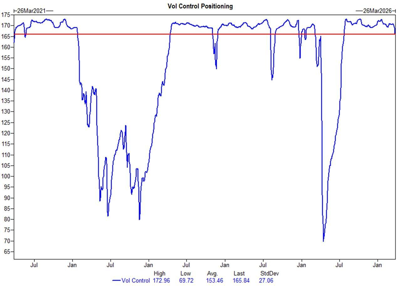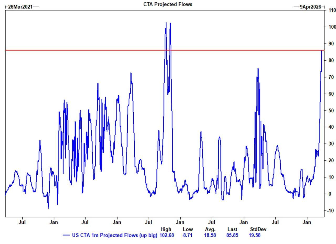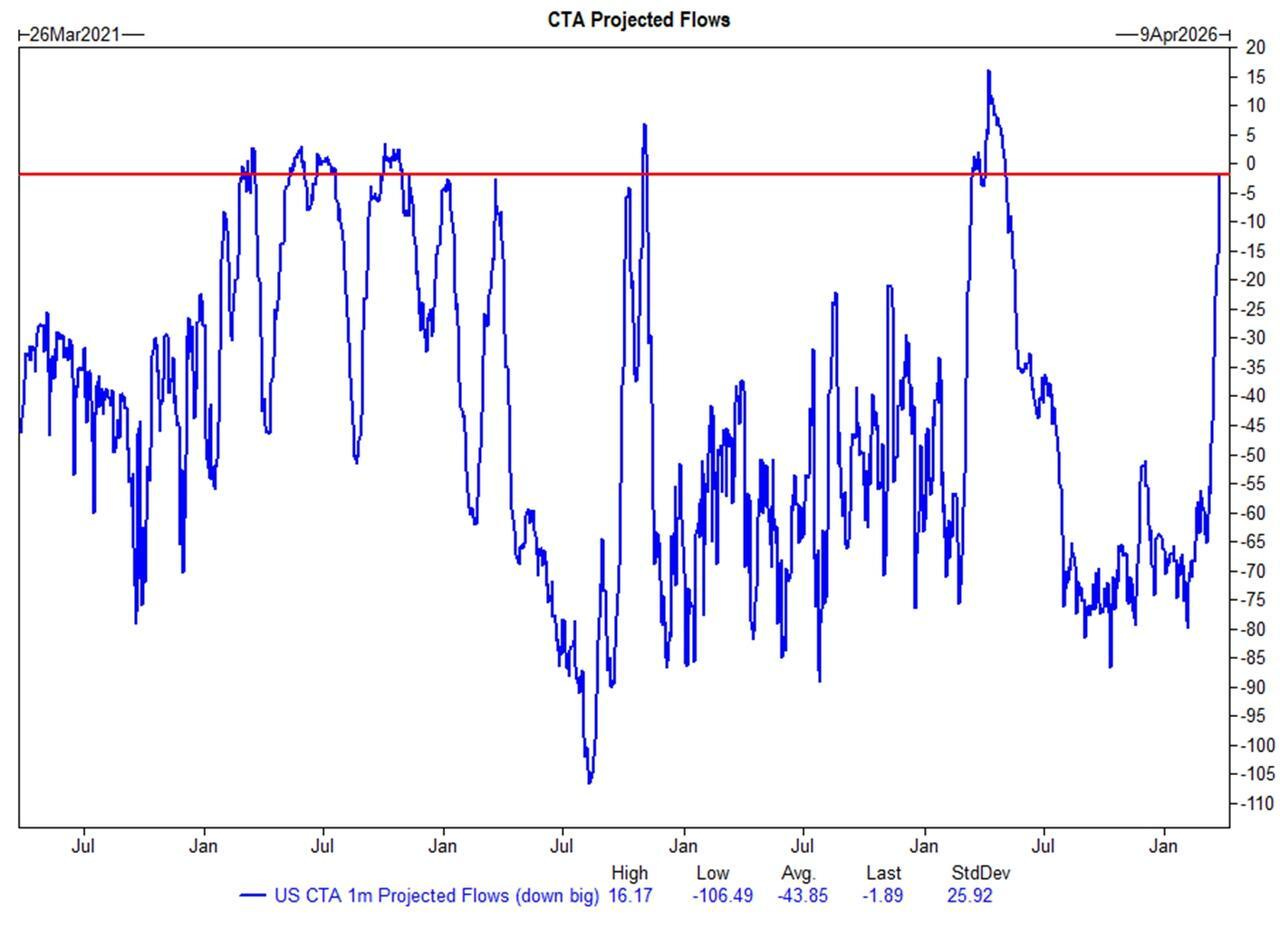 En el lado positivo, estimamos que los CTA comprarán casi 86.000 millones de dólares en acciones estadounidenses durante el próximo mes si vemos un repunte sostenido en el mercado al contado; esto se sitúa en el percentil 99 en un análisis retrospectivo de 1 año.