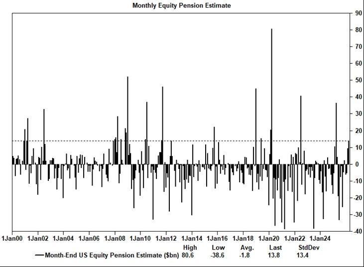 Según los modelos, los fondos de pensiones estadounidenses comprarán 14.000 millones de dólares en acciones estadounidenses a finales de mes. Esta compra de 14.000 millones de dólares se sitúa en el percentil 75 entre todas las estimaciones de compra y venta en términos de valor absoluto en dólares de los últimos tres años, y en el percentil 80 si consideramos los datos desde enero de 2000. También se ha modelado la cantidad equivalente de bonos que se venderán.