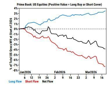 El actual régimen de baja liquidez se ha correlacionado con un mayor uso de ETF como mecanismo para abordar el riesgo macroeconómico. La semana pasada se registró la mayor venta neta en nuestra cartera de PB desde abril de 2025, con ventas en corto que superaron a las compras en largo en una proporción de 3 a 1. Esto nos mantiene alerta ante el riesgo de una posible crisis, ya que hemos observado una avalancha de cierres de posiciones cortas tras las noticias sobre resoluciones geopolíticas.