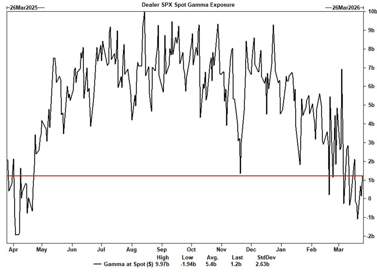 Jugar a la defensiva cuando se necesita atacar. El posicionamiento gamma de los intermediarios es prácticamente plano a nivel local, pero se acorta durante las caídas y se alarga durante los repuntes. Esto significa para las acciones estadounidenses que la actividad de cobertura de los intermediarios atenuará los movimientos alcistas del mercado, creando un obstáculo para un repunte sostenido, y los movimientos bajistas se intensificarán hasta finales de mes.