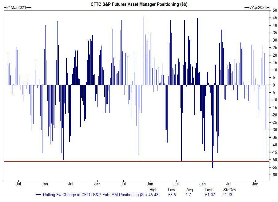 Los inversores institucionales han reducido sus posiciones en general. Los gestores de activos de la CFTC redujeron su posición bruta en el S&P en aproximadamente 51.000 millones de dólares en las últimas tres semanas; esta es la tercera mayor reducción bruta en un período de tres semanas si se comparan los últimos cinco años.