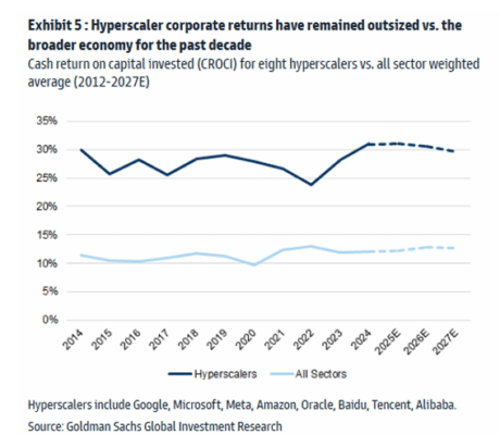Se espera que los retornos corporativos de los hyperscalers sigan siendo líderes y relativamente resilientes hasta 2027. Según nuestros analistas, el retorno en efectivo sobre el capital invertido por los hyperscalers globales se mantendrá cerca del 30% en 2025-27, en comparación con un rango del 25%-30% en 2014-23. Esto se compara con el promedio ponderado de todos los sectores, que ha oscilado entre el 10%-13% durante el mismo período.