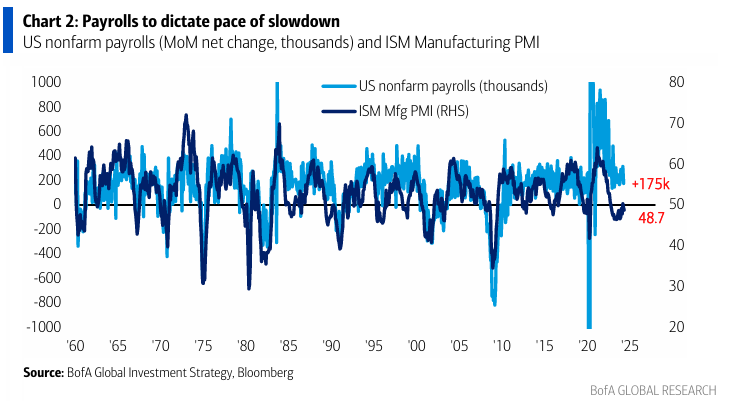 La Gran Imagen: las nóminas dictarán el ritmo de desaceleración de EE.UU.; la relación inventario-ventas dice que el PMI manufacturero se mantendrá por debajo de 50 en los próximos meses (Gráfico 5)… correlacionado con NFP (Gráfico 2); nóminas de mayo >225k… las probabilidades de un “no” aterrizaje (actualmente +30%) se mantienen altas, 175-225k un “aterrizaje suave” (50-60%) sigue siendo el caso base, y si es <125-150k las probabilidades de un “aterrizaje duro” (10%) vuelven a aumentar.
