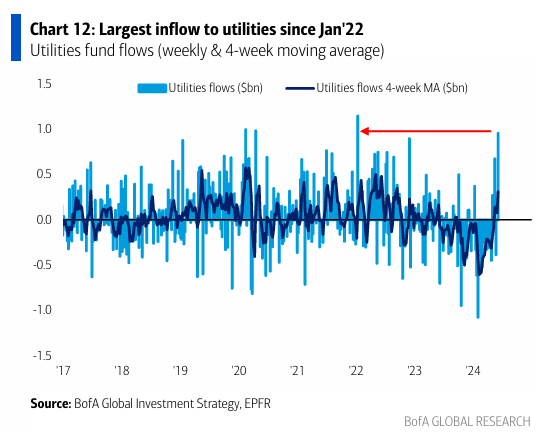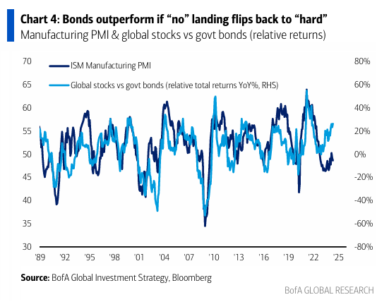 Cinta de la Historia: la Fed recorta +6 a solo 1 o 2, gasto del gobierno de EE.UU. -3% en los últimos 12 meses, ISM en contracción… macro impulsando correcciones del 10-20% en bienes de capital/transporte de carga (por ejemplo, FAST, LECO, MSM, incluso PH) + los constructores de viviendas no se recuperan con bonos; el Hombre en la Luna sabe que la Fed recorta al primer indicio de problemas, pero si los cíclicos no pueden recuperarse mientras se recortan las tasas de la Fed en la segunda mitad del año, significa que las probabilidades de un “no” aterrizaje vuelven a cambiar a un “aterrizaje duro” y los bonos superan en rendimiento (Gráfico 4)… comprar en las caídas en GT30.