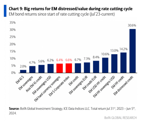 Sobre el Valor: en crédito y acciones, los alcistas han estado anticipando agresivamente el próximo ciclo de recortes de tasas, y se han concentrado en crecimiento sobre valor, grande sobre pequeño, monopolios sobre apalancamiento a pesar del gran crecimiento nominal del PIB que históricamente favorece el valor, pequeño, HY; así que es súper interesante que en EM, que ha liderado el ciclo global de endurecimiento y relajación, los bonos de valor/distressed han superado desde que comenzó el ciclo de relajación en julio de 2023 (Gráfico 9)… al menos la lectura para las acciones es que los activos de larga duración “distressed” (biotecnología, renovables…) y REITs/bancos regionales pueden resultar sorpresas relativas ganadoras en el segundo semestre.