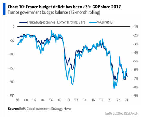 Sobre la Política: ciclo de recorte de tasas en marcha… bancos centrales globales en 2024… recortes de tasas = 48, aumentos de tasas = 18; nota 40 reuniones en junio… hasta ahora 3 recortes (BCE, DNB, BoC), 4 mantenimientos, sin aumentos; hasta ahora no hay una buena razón secular para mantener bonos del gobierno… el BCE recortó tasas y aumentó las previsiones de inflación por encima del objetivo del 2% durante los próximos 18 meses (2.8% en 2024 y 2.2% en 2025) mientras el déficit presupuestario del gobierno de Francia alcanzó un máximo histórico de €93 mil millones en los últimos 4 meses = >6% del PIB (el déficit de Francia ha sido mucho mayor que el límite del 3% bajo el Pacto de Estabilidad y Crecimiento de la UE desde 2017 – Gráfico 10)… no es de extrañar que el oro y las criptomonedas estén de moda; dicho todo esto, el ciclo siempre prevalece sobre lo secular, y los bonos aman un ciclo de relajación.