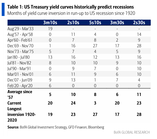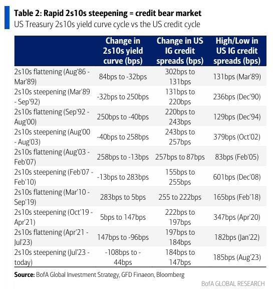 Sobre la Curva de Rendimiento: La inversión de la curva de rendimiento de EE.UU. ahora es la de mayor duración desde 1920 (Gráfico 11); la curva de rendimiento ha predicho 9 de las últimas 10 recesiones en EE.UU. en los últimos 70 años (Tabla 1)… ¡no esta vez!… el exceso de liquidez global, el QE/YCC “ADN” de los mercados, los retrasos monetarios extendidos por las hipotecas a tasa fija y la deuda corporativa refinanciada, la regulación (bancos sobrecapitalizados)… aún así la inversión se está volviendo menos invertida, y la historia dice que los retrasos son simplemente retrasos… si el panorama macroeconómico muestra que la Fed está “detrás de la curva” y necesita recortar bruscamente, la curva de rendimiento se volverá pronunciada rápidamente y cada ciclo de pronunciación de los 2s10s ha presenciado un mercado bajista de crédito (Tabla 2); una curva de rendimiento más pronunciada y acciones de bancos/fondos de capital privado más débiles son los “canarios en la mina de carbón.”