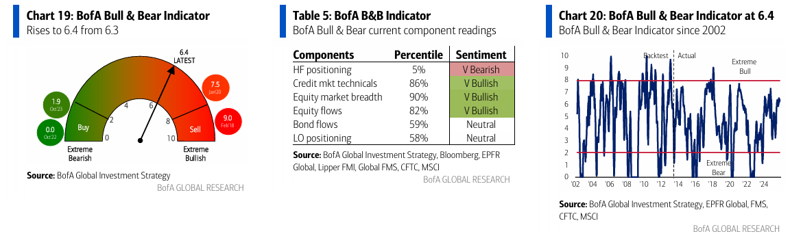 Sube a 6,4 desde 6,3 gracias a fuertes entradas en acciones de mercados emergentes, mejores condiciones técnicas en crédito y bajos niveles de efectivo según la encuesta FMS (3,8%), compensando las salidas de bonos high yield y el posicionamiento bajista de los hedge funds (récord de posiciones largas en bonos del Tesoro a 10 años vía futuros).