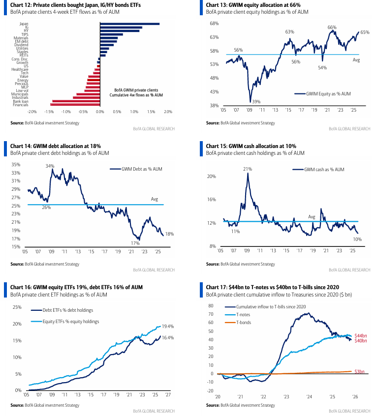 Los clientes privados llevan 8 semanas vendiendo acciones al ritmo más rápido en un año (salida de $12 mil millones), mientras las compras de bonos se están anualizando a un flujo de entrada de $30 mil millones.