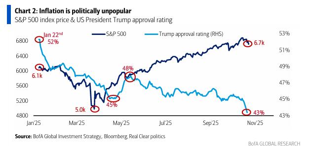 La aprobación de Trump se sitúa en el 43% (Gráfico 2 – 41% en economía, 36% en inflación); políticamente es imperativo que en 2026 la inflación y los déficits presupuestarios estén bajo control… de ahí que el rally contracorriente en bonos cupón cero probablemente continúe.