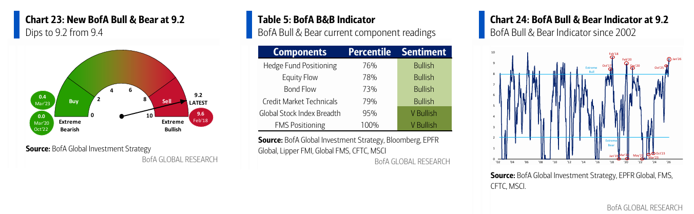 Indicador Bull & Bear de BofA: baja a 9,2 desde 9,4 por fuertes salidas de ETFs de renta variable/EM y un descenso de la amplitud de los índices globales, compensado por posicionamiento alcista en la encuesta FMS de BofA (p. ej., nivel de efectivo en mínimo histórico del 3,2%). El indicador B&B “antiguo” baja a 7,0 desde 7,5.