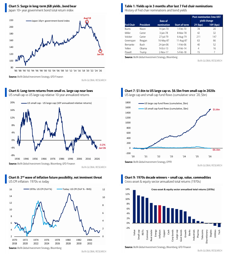 ABB… Anything But Bonds (Todo menos bonos): el repunte de los rendimientos a largo plazo en Japón hasta máximos desde 1999 (el 30 años alcanzó 3,9%) implica que, de pico a valle, el precio del Treasury USA a 30 años cae un 50% y el JGB a 30 años un 45% en lo que va de los 2020 (Gráfico 5). En la primera mitad de los 2020, el mercado bajista de bonos provocó un bull ABB en oro, bancos UE/JP y tecnología USA/Mag 7. Creemos que en la segunda mitad de los 2020 las small/mid caps y los Mercados Emergentes serán los nuevos beneficiarios del ABB… como en los años 70, cuando controles de salarios y precios, políticas fiscal/monetaria procíclicas y la devaluación del dólar (fin de Bretton Woods) llevaron al pico del bull de las Nifty 50 en 1972 y al oro (1971-74), reemplazado por small caps (1975-77) como el mejor activo (Gráficos 9 y 12). GLD, GNR, EEM, MDY, IJR son nuestros beneficiarios favoritos del ABB en 2026.