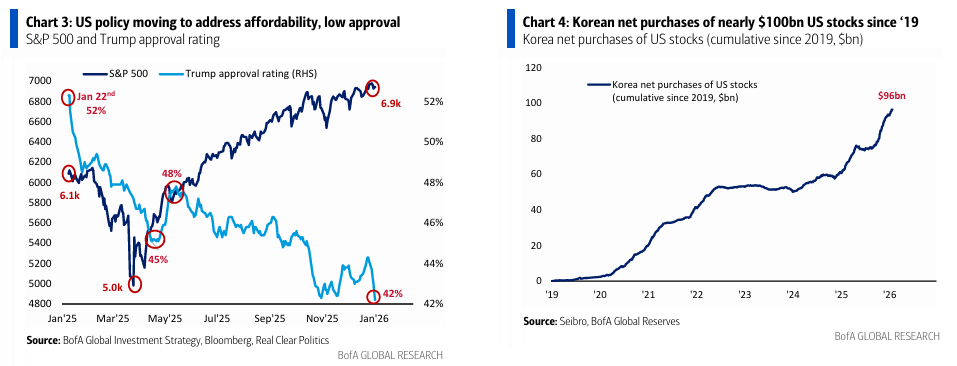 • Política (doméstica): giro agresivo de Trump para abordar la asequibilidad (aprobación 42%, nuevo mínimo el viernes pasado – Gráfico 3), no vía política monetaria, fiscal, comercial ni precios de activos, sino mediante intervención gubernamental agresiva (nuestra visión de “mano invisible a puño visible”) en sectores corporativos para controlar precios… “drill, baby, drill” para bajar la energía, aranceles para reducir el coste sanitario en ’25, y en ’26 presionar a bancos para bajar tipos de tarjetas, frenar a private equity en compra de viviendas y hacer que la tecnología pague la generación eléctrica de centros de datos. Intervención para reducir precios de energía, sanidad, crédito, vivienda y electricidad vía márgenes de beneficio de las grandes corporaciones… de ahí la infrarentabilidad de big energy, big healthcare y big insurance en ’25 mutando hacia PE, grandes bancos y big tech en ’26… y por qué small & mid cap es la mejor jugada para el “boom” de la economía real, el reshoring y la renacimiento manufacturero de cara a las midterms de EE. UU.