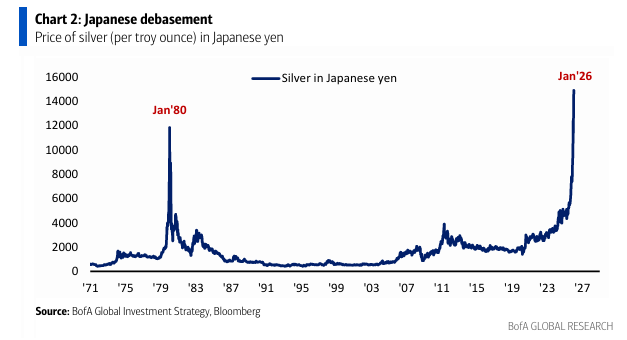 La gran imagen: el precio de la plata en yenes japoneses en máximo histórico (Gráfico 2), superando el máximo de 1980; la devaluación de Japón y la debilidad de las divisas asiáticas están impulsando fuertes salidas de capital hacia activos de EE. UU. y la UE (p. ej., 100.000 millones de dólares de minoristas coreanos hacia acciones estadounidenses – Gráfico 4); vigilar el dólar australiano frente al yen japonés… AUDJPY >110 = ruptura de varios años hacia un máximo de 35 años = el riesgo sigue activo; fallo (por el BoJ, intervención) = pico del ciclo virtuoso de “divisas asiáticas débiles–grandes salidas de capital”.