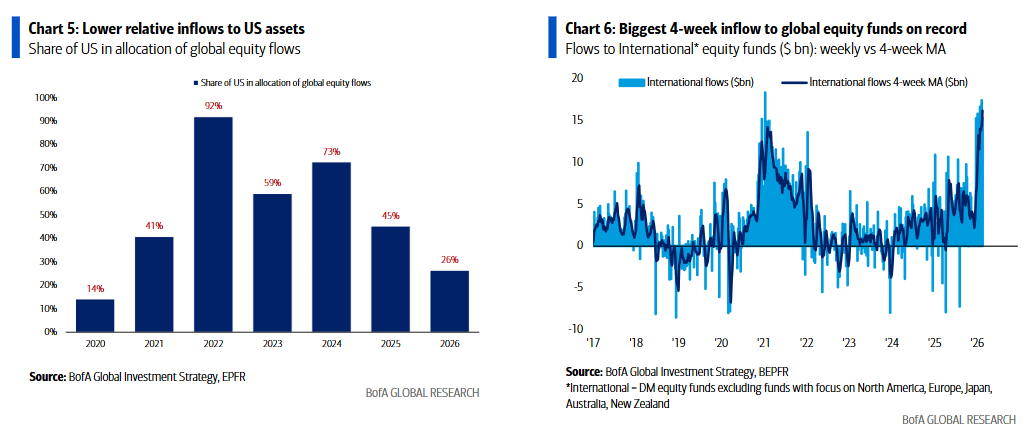 En 2026, por cada 100 dólares que han entrado en fondos globales de renta variable, las acciones estadounidenses han captado solo 26 dólares, su menor cuota desde 2020 (gráfico 5).