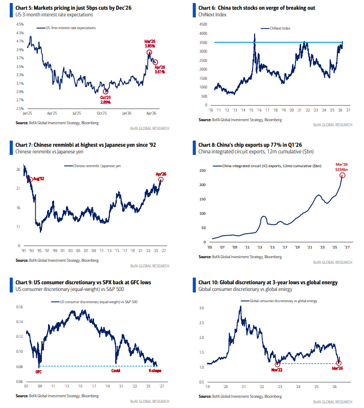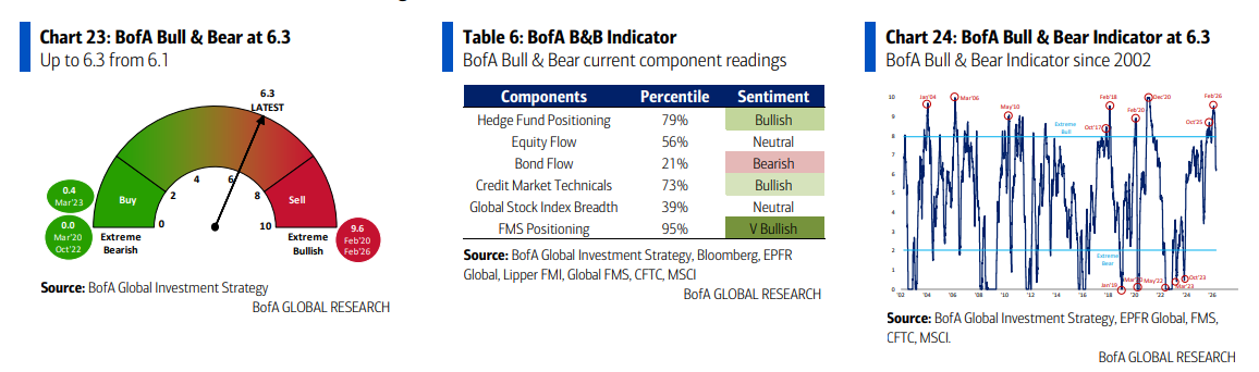 Indicador Bull & Bear de BofA: sube a 6,3 desde 6,1; entradas en deuda HY y EM, compresión de spreads de crédito HY y AT1, mayor posicionamiento alcista en S&P 500, oro y futuros del Treasury a 2 años, compensado por salidas en tecnología y el tono bajista de la encuesta global FMS de abril (efectivo 4,3%, inversores menos sobreponderados en acciones frente a bonos); el indicador “antiguo” baja a 5,3 desde 5,4.