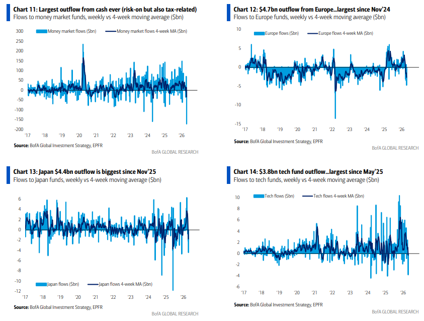 Flujos semanales: 11.300 M$ hacia acciones, 7.900 M$ hacia bonos, 1.200 M$ hacia oro, 1.200 M$ hacia cripto, 172.200 M$ saliendo de efectivo.