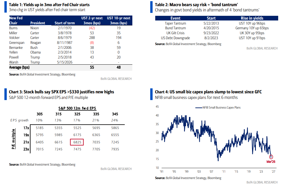 Los bajistas macro dicen: “no se puede comprar riesgo hasta que la inflación toque techo”… el riesgo en Q2 es petróleo al alza, CPI al alza, yields al alza y un bond tantrum (como en 2013, 2015, 2022, 2023 – Tabla 2) por la combinación de una reaceleración inesperada del mercado laboral, un dólar estadounidense débil por factores geopolíticos y presión para que Warsh adopte un tono dovish (en los 3 meses posteriores al inicio de 7 nuevos mandatos de la Fed, las yields subieron de media 50 pb – Tabla 1).