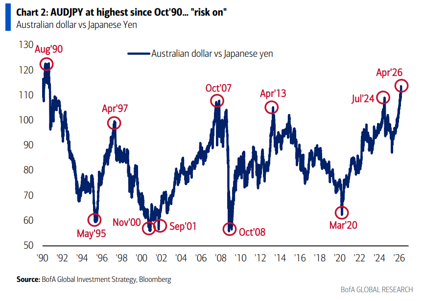 La gran imagen: nada refleja mejor un entorno risk-on que el dólar australiano (FX cíclico) en sus niveles más altos frente al yen japonés (FX de financiación) desde octubre de 1990 (Gráfico 2).