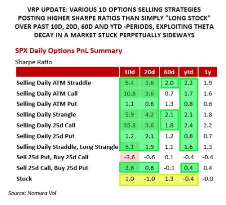 Obviamente, la naturaleza del gran AUM en productos de Overwriting / Premium Income / Yield Enhancement no es tan de corto plazo como el ejemplo ilustrativo que mencioné antes, pero los “Sharpe ratios suaves” —es decir, retornos ajustados por riesgo aparentemente más estables— que han mostrado diversas estrategias de venta de opciones en lo que va de año son otro argumento más que explica el crecimiento del AUM y de la demanda en estos productos, frente a simplemente estar “long acciones”.