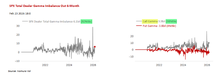 Y eso implica que la enorme oferta de Vega procedente del espacio QIS (VRP / Premium-Income / Exóticos y Notas estructuradas) alimenta a los dealers y market makers con una gran cantidad de Gamma que “ahoga” el mercado, tanto cerca del dinero (ATM) como fuera del dinero (OTM), especialmente en el lado de las calls.