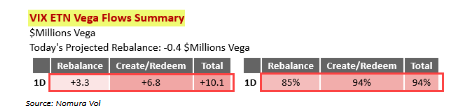 No obstante, la avalancha de catalizadores negativos para el sentimiento en renta variable ayer —que arrastraron a los mercados— SÍ provocó una “nueva” y sustancial reanudación en un solo día de demanda NUEVA de “Long Vol” en ETNs del VIX, con una compra de +6,8 millones de dólares en Vega a través de creaciones de ETNs, más +3,3 millones adicionales en Vega derivados del rebalanceo con la volatilidad al alza durante la sesión, lo que supone un impacto acumulado diario de +Vega en el percentil 94.