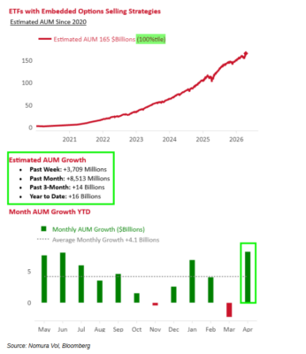 Y ahora mismo, la proliferación de estrategias de venta de opciones —productos de overwrite, notas estructuradas, QIS, VRP, dispersión, etc.— sigue alimentando ese “gorila” de forma mecánica, con los activos bajo gestión creciendo en un entorno donde muchos inversores buscan ingresos.