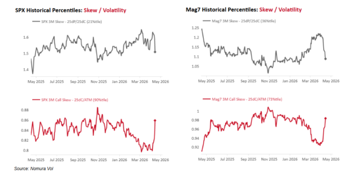 Lo llamativo es cómo el skew de opciones sobre índices, que anteriormente estaba “priceando crash”, se ha aplanado con fuerza (demanda impulsiva de calls mientras las puts han sido prácticamente aniquiladas), para después empinarse agresivamente el skew de calls (demanda de calls fuera del dinero frente a at-the-money, a medida que los traders buscan exposición a la cola derecha).