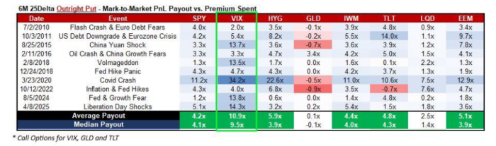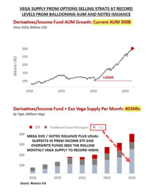 Además, añadiría que la creciente popularidad de cubrir el riesgo de “crash” mediante calls sobre el VIX —que ofrecen pagos muy elevados por su convexidad, dado que el VIX ya es la raíz cuadrada de la varianza, a lo que se suma el componente opcional— y que, como siempre señalo, el mercado de opciones sobre el VIX tiende a generar “squeezes” de gamma negativa por parte de los dealers (que acaban autocumpliéndose debido a las duras realidades de la gestión de riesgo y la dificultad para reciclar posiciones), está creando un producto que cada vez acumula más “convexidad sobre convexidad”.