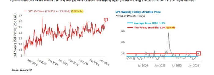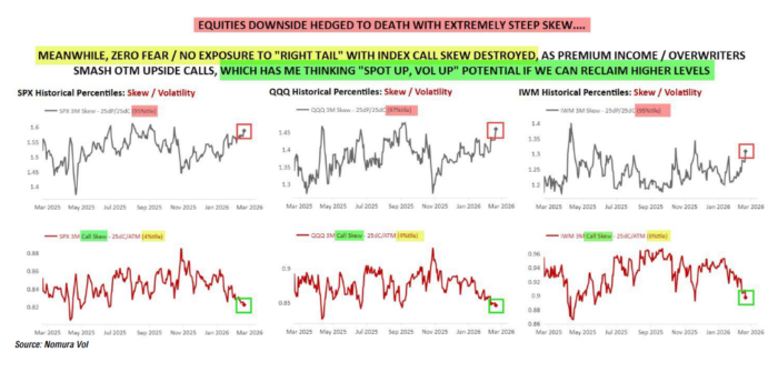 Creo que este skew extremadamente pronunciado —con fuerte demanda de protección a la baja en índices, sesgo alcista en el VIX y volatilidad implícita elevada debido a una sobrecobertura generalizada— pese al reciente desapalancamiento y reducción de exposición neta, está muy expuesto a un evento de volatilidad (Vol Melt).