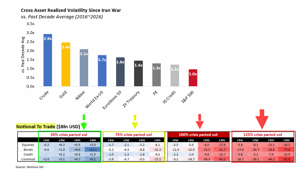 Incluso si la volatilidad se redujera a “solo” el 75% de la “volatilidad de crisis” de Irán desde el 28/02/26, eso seguiría empujando al alza la volatilidad realizada en horizontes largos de lookback que partían de niveles mucho más bajos, lo que implica desapalancamiento de activos…
