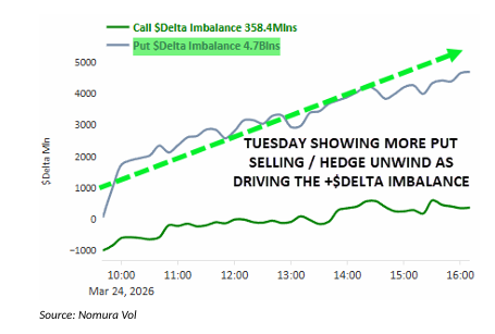 lo que incentiva a los propietarios de coberturas a cerrar dichas posiciones (asumiendo pérdidas de rendimiento con coberturas que siguen drenando rentabilidad, mientras que además todos han reducido significativamente su exposición subyacente), lo que en conjunto provoca que estas puts cada vez más fuera del dinero (OTM), que están perdiendo delta, queden expuestas a deshacerse generando un mayor efecto vanna; por ejemplo, el desequilibrio de delta en opciones put sobre SPY fue de +4.700 millones de dólares ayer frente a solo +358 millones en delta de calls, a medida que se cerraban puts y los dealers / market makers recompraban futuros