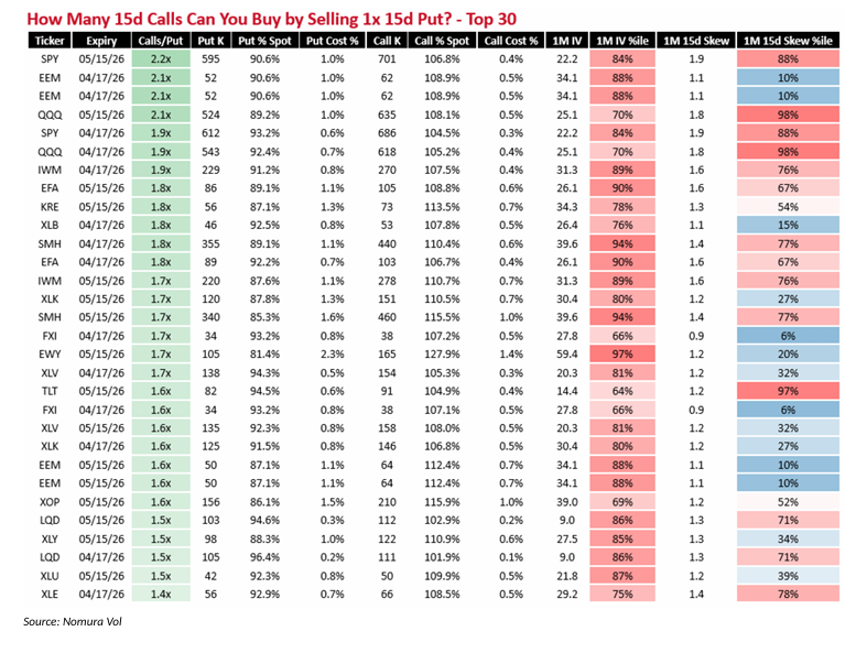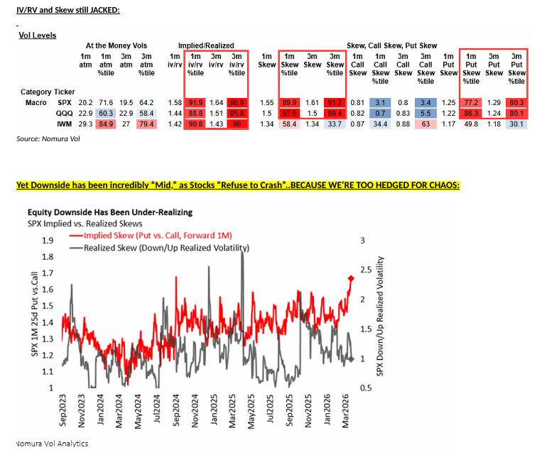 Y es una historia bastante similar en la volatilidad de índices de equities / ETF—las conversaciones muestran que los gestores discrecionales, en el fondo, están tentados y “quieren” tomar algunas apuestas tácticas a corto plazo para PONERSE CORTOS en este SKEW tan exageradamente empinado (donde las puts siguen estando mucho más caras que las calls),