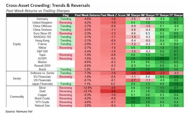 El apalancamiento bruto amplio de hedge funds, comprensiblemente, ha caído con fuerza desde los extremos previos tras el desapalancamiento de las operaciones anteriormente conocidas como “High Sharpe”, que han sufrido flujos persistentes de liquidación, por ejemplo, el oro había caído durante 9 sesiones consecutivas antes del rebote de ayer