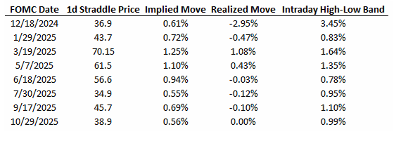 El straddle del FOMC solo se ha realizado 1 vez de las últimas 12 en el último año, y el mayor movimiento close-to-close en las últimas 4 reuniones ha sido solo 12 pb.