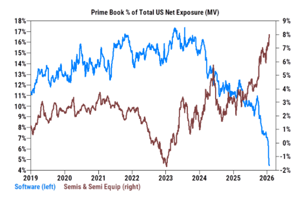 Recordatorio: la exposición neta a software (como % del libro Prime total de EE. UU.) tocó techo en 17,7% a mediados de 2023 y ha caído 13 pp en los últimos 2,5 años hasta 4,7%, el nivel más bajo del registro. En el mismo periodo, la exposición neta en semiconductores y equipamiento ha subido de 2,2% a 8%, el nivel más alto del registro. Vigilamos de cerca Software vs Semis (GSPUSOSE): el par cae -18% en el año. Resultados serán el próximo catalizador claro para el sector.